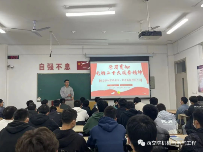 会议第一项、樊佳伟同学就大会的主题、二十大重要内容、二十大关键词、二十大金句等六部分向同学们进行阐述。会议第二项、樊佳伟同学带领大家进一步回顾十九大历程,认识十九大党章的三个“新变化”、两个“新特点”。随后讲了党的二十大三个主题:高举中国特色社会主义伟大旗帜、全面贯彻习近平新时代中国特色社会主义思想,弘扬伟大建党精神,自信自强,守正创新、勇毅前行,为全面建设社会主义现代化国家,全面推进中华民族伟大复兴而奋斗。明确提出二十大的第一要务是高质量发展是全面建设社会主义现代化国家的首要任务。党章是立党、治党、管党的总章程,是把握党的政治方向的根本准则。接着樊佳伟同学带领大家对二十大的“关键词”进行更深层次的学习。通过从“中国式现代化”到“创新发展”的对比,深刻领会“创新发展”战略思想和创新理念。同学们学习二十大的热情也在持续升温,在不断学习中领会二十大精神的核心要义和精髓,进一步坚定为实现中华民族伟大复兴的中国梦不懈奋斗的理想信念。