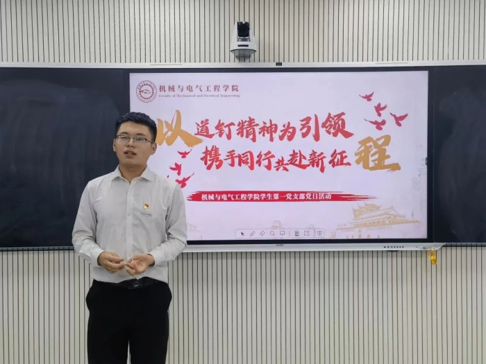 学生代表李康结合自身成长经历,将“西迁人”群体坚守报国之志的胸襟与情怀以生动的事例娓娓道来。结合自身成长领悟到,要有“一钉守护、万钉同心”的道钉精神,也正是我们机电学子应该传承发扬的优秀品质,生逢盛世,也肩负重任,踏实肯干,以永不懈怠的精神状态努力践行为国为民的青春誓言。