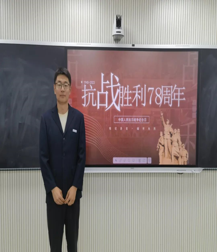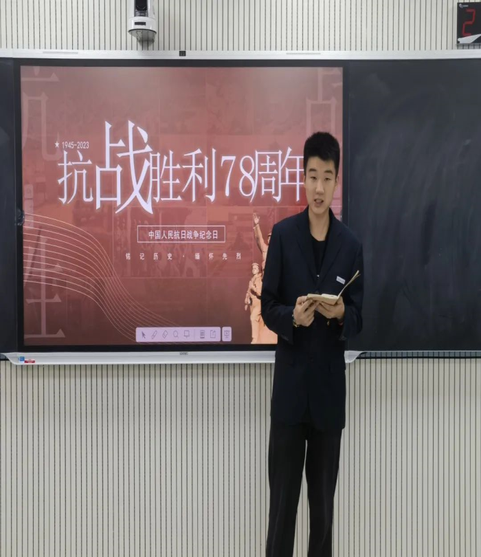常宇楠讲到,78年前,中国人民经过艰苦卓绝的抗战,终于打败了日本侵略者,赢得近代以来中国抗击外敌入侵的第一次完全胜利。这场战争虽然付出了巨大的代价,但赢得了世界的尊重和关注,也让我们更加深刻地认识到民族独立和自由的重要性。身为新时代的青年,我们应时刻牢记时代使命,保持积极进取的学习和工作的态度,提高积极性和主动性,把内在精神落实到学校各项活动中,不断增强凝聚力和战斗力,勿忘历史,珍爱和平!振兴中华,吾辈自强!