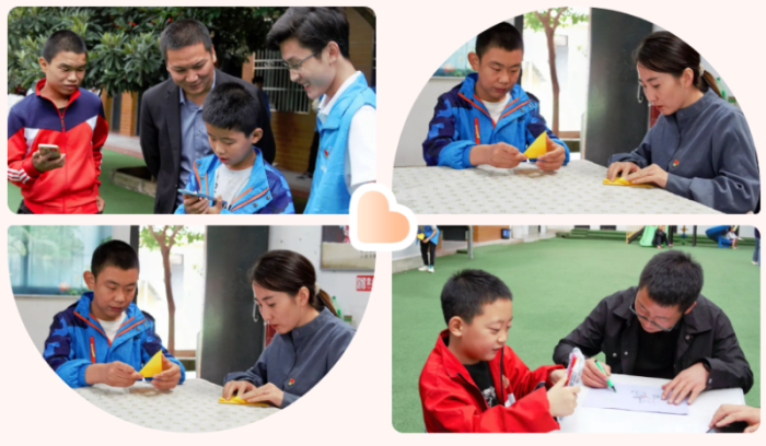 教室外,老师们详细了解了孩子们的生活、身体、学习情况,聆听他们的心声,让孩子们敞开心扉,找回自信,感受到社会大家庭的温暖。王拓辉书记和李阳光老师带着小朋友用彩色水笔在卡纸上绘画,画出了他的天真童趣;赵伟冬老师陪着小朋友一起用卡纸折起了纸飞机,承载着欢乐飞向天空;赵晨玲老师领着小朋友一起唱歌曲“大梦想家”,唱出了她的欢乐和喜悦;王静、周盟、魏娜老师在详细聆听他们的情况后不禁落泪,对他们的坚强乐观感到欣慰;申茹茹、周明老师带着小朋友们玩耍院内的滑梯,孩子们天真的笑声在身边回荡;王新焕、王珺老师在宿舍和教室参观孩子们的居住环境和学习状况,赞叹他们克服困难也要努力学习、自强不息。我院党员同志通过红色故事讲解和交流互动等形式,宣传党的政策,传递温暖和爱心,激励聋哑小学的学生们积极面对生活,努力学习成才。