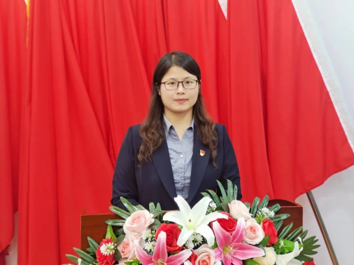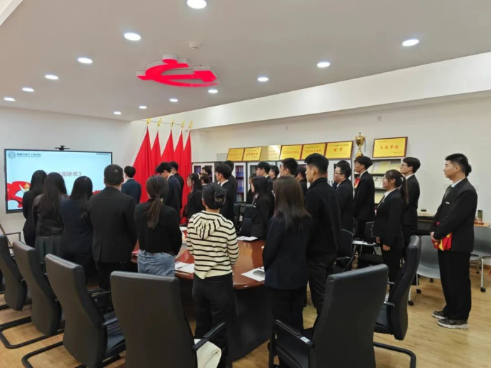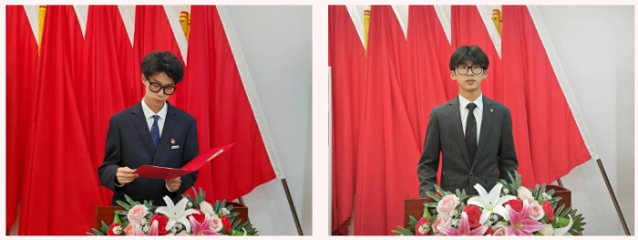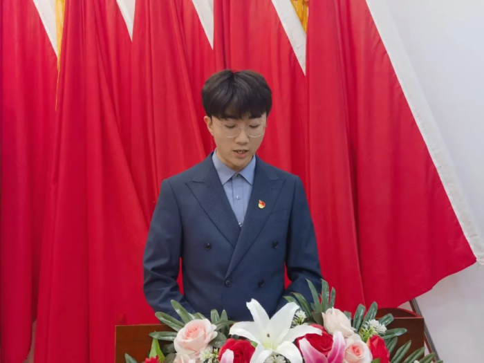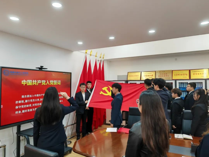 宣传委员朱媛媛同志带领大家进行集体宣誓,高举右臂,紧握右拳,面对着党旗,庄严肃穆地诵读出字字千钧的入党誓词。入党誓词不长,但是每一个字,每一句话,都是掷地有声,铿锵有力的,那是一代代中国共产党人用生命、用意志、用奉献、用忠诚践行对党的铮铮誓言。入党宣誓,是回首峥嵘百年党史的精神根脉,是反躬自问青年同志的入党初心。全体新发展党员目光沉稳坚毅,铿锵有力的誓言传达出他们在思想上和行动上向党组织积极靠拢的决心和意志。相信握拳宣誓的青年人也将牢记使命初心,绽放青春之花。