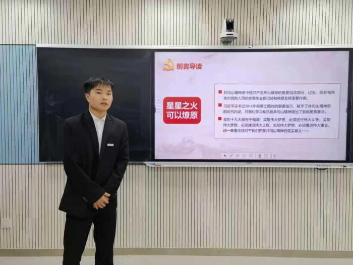 他结合新时代、新征程、新要求,从井冈山斗争历史、井冈山精神内涵、弘扬井冈山精神三个方面进行分享,详细阐述井冈山的革命斗争历史,带领大家深入学习井冈山精神的深刻内涵、党的优良传统和工作作风,以革命征程上共产党员的先进事迹为例,引导大家感受革命战争年代的战火纷飞,提醒同学们铭记老一辈无产阶级革命家的精神风范,领会坚定理想信念、担当伟大使命的重要性。
