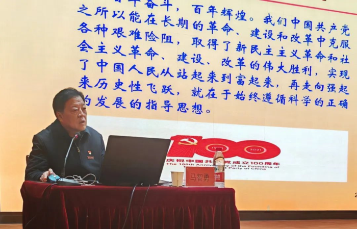 最后,由马智勇为培训班学员讲授第一讲《中国共产党的指导思想》,从历史的角度向学员们讲述中国共产党建党以来的艰难困苦,体现为寻找一条适合旧中国发展的道路党经历的艰辛之重、遭受的苦难之深、付出的代价之大,中国特色社会主义道路是中国共产党带领中国人民用鲜血和生命、智慧和汗水换来的,是在中华大地铸就的一条苦难辉煌之路,表示希望学员们在今后的学习生活中,能够树立远大理想、厚植奋斗本领、锻炼坚强脊梁、增强历史使命感,做敢担中华民族伟大复兴事业的忠实践行者、持续奋斗者、积极实践者。