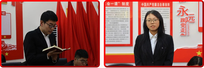 大会伊始,王新焕介绍本次大会党员出席情况,并介绍会议流程。按照会议流程,18名发展对象依次宣读入党志愿书,从自己对党的认识、入党动机、个人履历、家庭和主要社会关系情况,以及需向党组织说明的问题等方面进行了汇报。随后由入党介绍人根据对发展对象的了解,总结各发展对象的表现情况以及待改进之处。最后经支部党员逐一讨论和无记名投票表决,同意接收常宇楠、张伟等18名同志为中共预备党员。