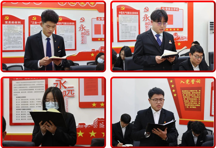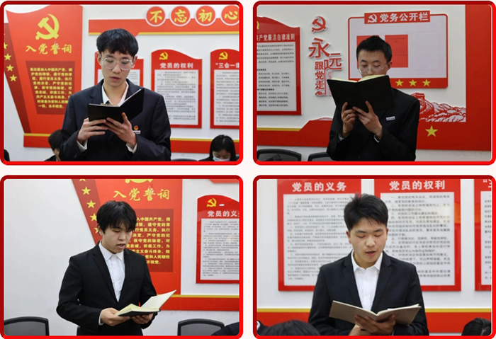 在党旗下,18名预备党员庄重肃穆进行入党宣誓,他们表示:会不忘初心跟党走,继续加强政治学习,不断增强理论水平,真正在思想上入党,不断以党员的身份严格要求自己,改正不足;坚定理想信念,保持热情,始终如一,不忘初心,牢记使命,在学习工作中发挥带头作用,带领大家共同进步,争取早日成为一名优秀的中国共产党党员。”