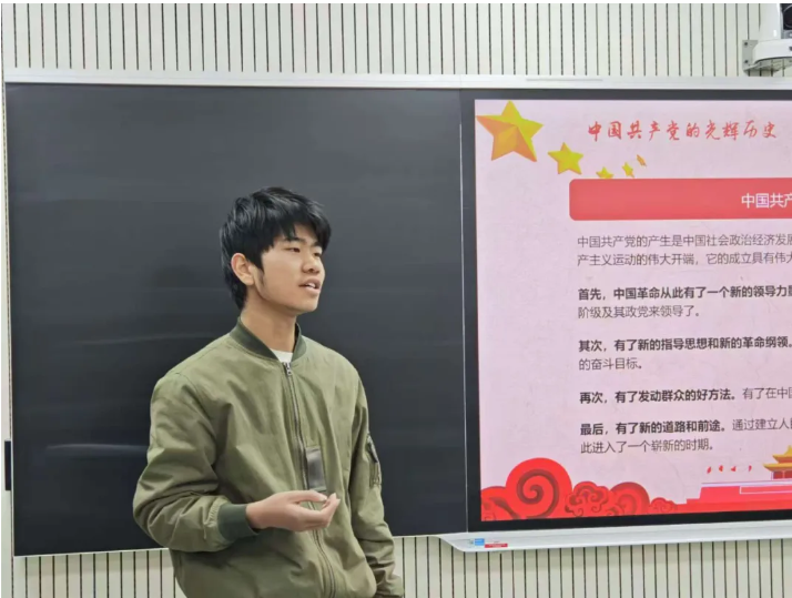 党课中,毛旭阳同学通过回顾党的百年奋斗历程,生动阐释了党史学习的重要意义。他指出,党史学习有助于深刻理解党的初心使命和历史责任。积极分子应以习近平新时代中国特色社会主义思想为指引,在学习和实践中不断砥砺成长,努力成为高素质的新时代青年,为实现中华民族伟大复兴贡献青春力量。