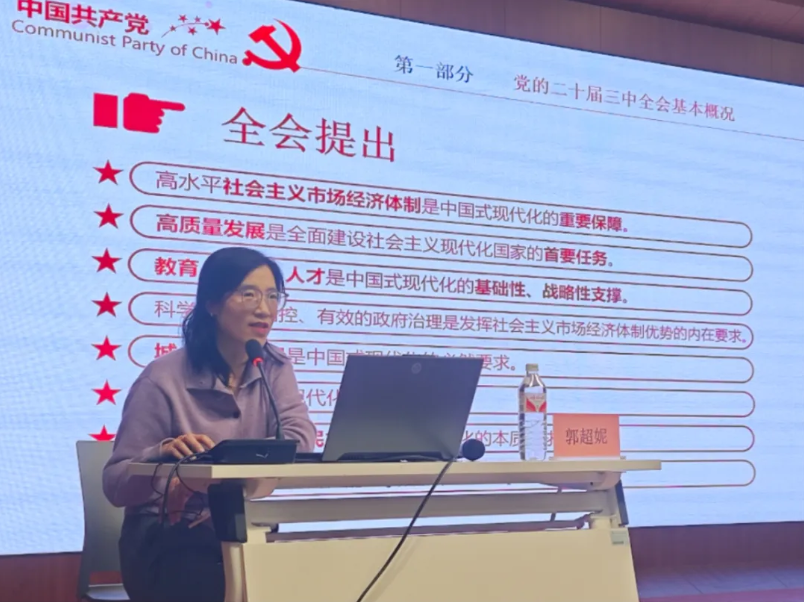 郭超妮首先阐述了二十届三中全会召开的重大意义,强调会议在推动中国式现代化、全面建设社会主义强国及民族复兴的关键时期召开,为我国进一步深化改革、推动高质量发展提供了明确方向。郭超妮重点讲解了全会通过的《中共中央关于进一步全面深化改革、推进中国式现代化的决定》,并对构建高水平社会主义市场经济体制、完善经济高质量发展体制机制、以及创新驱动发展等一系列政策部署进行了详细解析,强调这些举措将有效推动我国经济社会各领域的高质量发展。