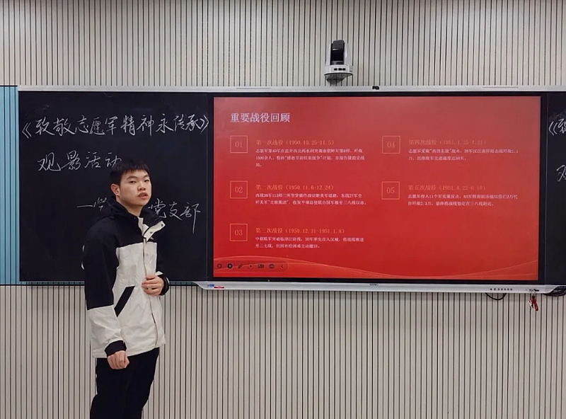 活动伊始,谭泊敏锐同学以PPT为载体,系统讲解了抗美援朝战争的历史背景与起因,从朝鲜半岛分裂对峙、美国干涉朝鲜内政等战争爆发原因,到中国出兵的战略权衡、道义责任与保家卫国的必然选择,清晰梳理了战争的来龙去脉。同时,他还回顾了第一次战役到第五次战役的关键过程,让大家对战争全貌有了更深入的认知。
