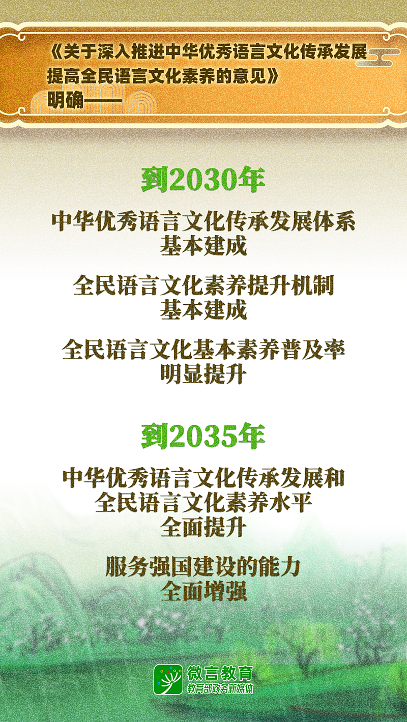 到2030年,中华优秀语言文化传承发展体系基本建成,实现科学阐释、教育普及、资源开发、数字赋能、队伍建设、推广传播、交流互鉴等协同发展;全民语言文化素养提升机制基本建成,全民语言文化基本素养普及率明显提升。到2035年,中华优秀语言文化传承发展和全民语言文化素养水平全面提升,服务强国建设的能力全面增强。