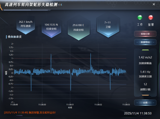 转向架作为高速列车核心走行部件,其在高速运行中易产生横向异常振动并引发蛇形运动失稳,严重威胁行车安全与旅客舒适度。该项目研发的高速列车转向架蛇行失稳检测装置适用于检测高速列车转向架蛇行运动失稳的实时监测系统,判断高速列车在运行过程中转向架的振动状态是否正常,当发生蛇行运动失稳现象时能够及时报警,提供给司机或者随车机械师以便采取响应的措施,以保证列车的运行安全。同时将发生失稳的相关信息,如失稳转向架的编号,失稳发生的时间,地理位置等内容保存在系统中,以便为以后对失稳现象的分析和处理提供数据依据,为排查整治机车车辆异常振动,保障铁路运输安全、生产秩序及服务品质可提供重要技术支持。