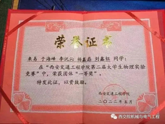 2022年4月参加校级物理实验竞赛,荣获团体一等奖。