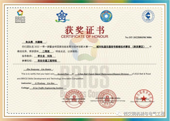 “2022一带一路暨金砖国家技能发展与技术创新大赛—城市轨道交通信号维修技术赛项”省赛于2022年11月29日在线上举行。我校两名学生在指导老师带领下,积极准备、认真参与,圆满完成了本次比赛的所有任务,并获得了省级二等奖,再次展现了我院学子的优秀素质和扎实的技术能力。