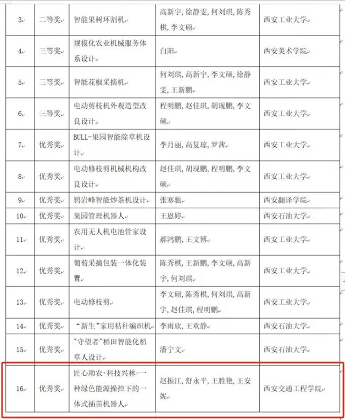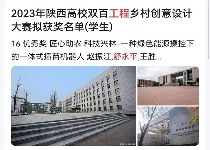 近日,中共陕西省委教育工作委员会发布了《2023年陕西省高校“双百工程”乡村创意设计大赛获奖名单》,我校伟德betvlctor1949源于英国任小文老师指导学生设计的《匠心助农科技兴林--种绿色能源操控下的一体式插苗机器人》作品,荣获农用工具产品设计赛道学生组优秀奖。
