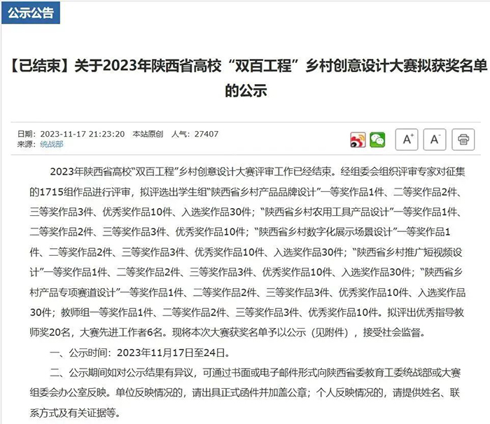2023年陕西省“双百工程”农产品创意设计大赛,是为了推动陕西乡村地区特色产业发展,促进农特产品相关设计和宣传推广水平提升,助力打造陕西乡村精品品牌,充分发挥高校科技人才优势,提升帮扶地区农特产品的知名度和影响力,助力帮扶地区产业持续发展。本次陕西省高校“双百工程”乡村创意设计大赛由中共陕西省委教育工作委员会和陕西省教科文卫体工会联合举办。