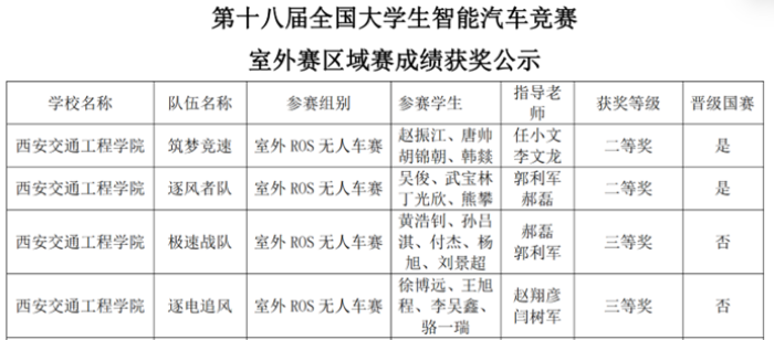 全国大学生智能汽车竞赛是受教育部高等教育司委托、由中国自动化学会主办的全国顶级赛事,以智能汽车为研究对象的创意性科技竞赛,是教育部倡导的大学生科技竞赛之一。我校学生参加室外ROS无人车竞速赛赛项,经过几个月的训练,最终取得了骄人的成绩。