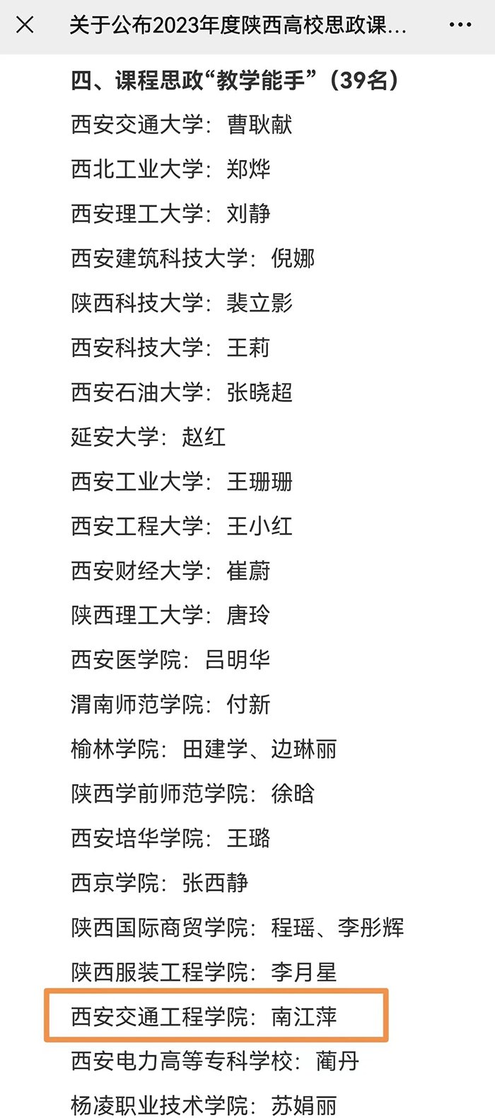 根据《关于开展2023年度陕西学校思政课教师“大练兵”省级展示活动的通知》(陕教工宣办〔2023〕33号)和《关于举办2023年度陕西高校思政课程课程思政教师“大练兵”省级现场展示活动的通知》(陕教工宣办〔2023〕35号)安排,经高校推荐、网络初评、现场展示、专家评审等环节,陕西省教育厅于2023年12月22日确定了2023年度陕西高校思政课程课程思政教师“大练兵”省级展示结果,其中,我院电气工程教研室南江萍老师荣获省级“教学能手”称号。