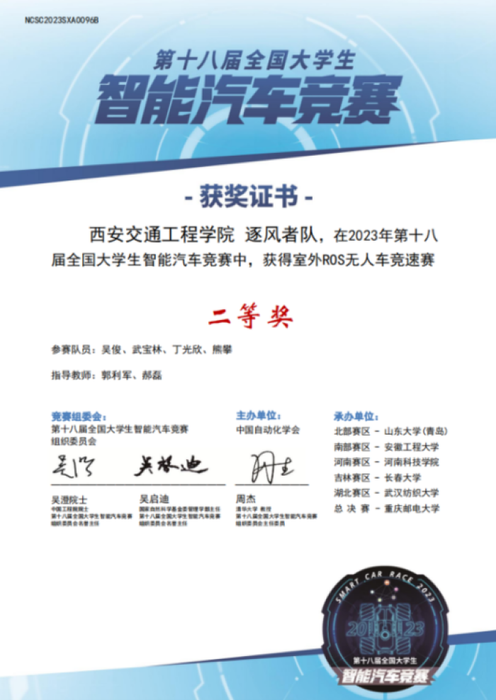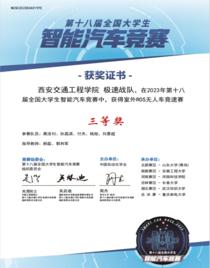 全国大学生智能汽车竞赛是受教育部高等教育司委托、由中国自动化学会主办的全国顶级赛事,以智能汽车为研究对象的创意性科技竞赛,是教育部倡导的大学生科技竞赛之一。我校学生参加室外ROS无人车竞速赛赛项,经过几个月的训练,最终取得了骄人的成绩。