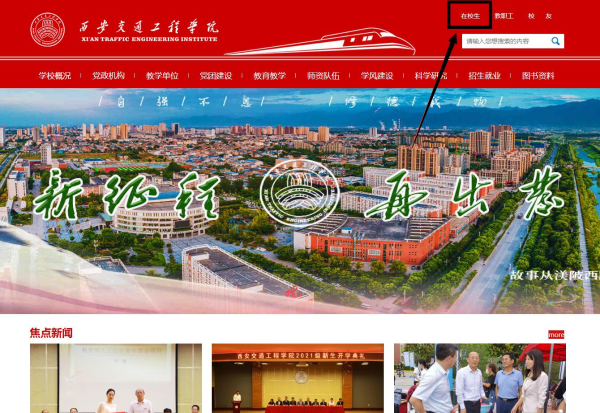 1、登陆伟德国际1949官网(http://www.xjy.edu.cn/),在右上方查找“在校生”,点击打开。