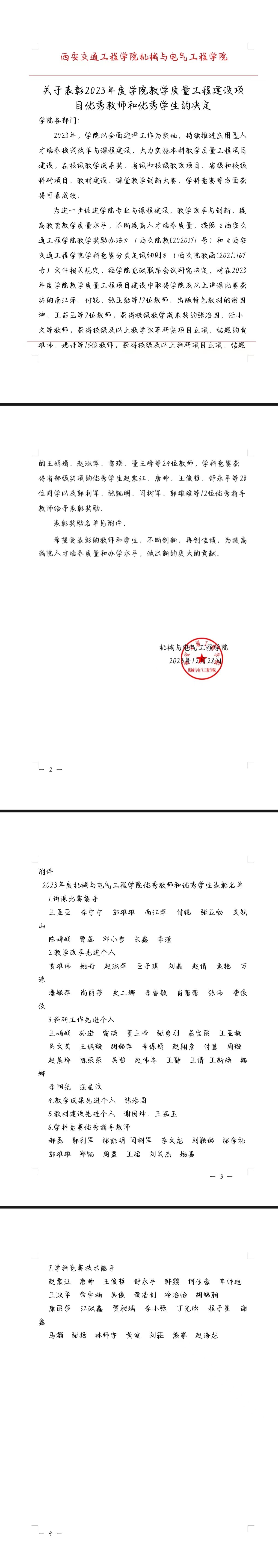 关于表彰2023年度学院教学质量工程建设项目优秀教师和优秀学生的决定