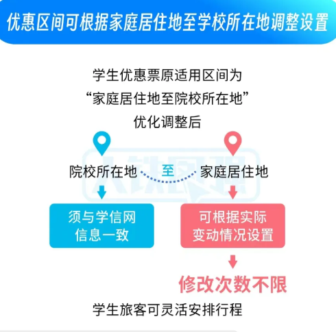 优化调整后,院校所在地须与学信网信息一致,家庭居住地可根据实际变动情况设置,修改次数不限,学生旅客可灵活安排行程。