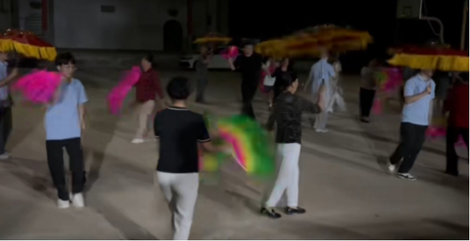 张塔村地处陕北腹地,层层黄土宛如厚重年轮,孕育出独具地域特色的陕北秧歌文化。这一源于农耕祭祀的民间艺术,以“祈福禳灾”为精神内核,将劳动场景、民俗信仰与艺术表达有机融合。实践队抵达时,正值村秧歌队排练:老艺人们手持彩扇,步随鼓点腾挪转动,或如麦浪翻滚,或似骏马奔腾,尽情展现出黄土地人民的生命气韵与精神风貌。