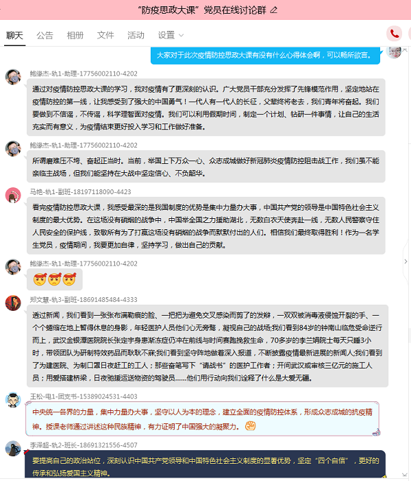 通过本次“思政大课”的线上学习,同学们纷纷表示益匪浅、收获良多。许多党员同志积极主动地向党支部递交自己的学习的心得。大家也纷纷在党员学习群里畅谈自己对于战“疫”的思考与感悟,反响热烈。