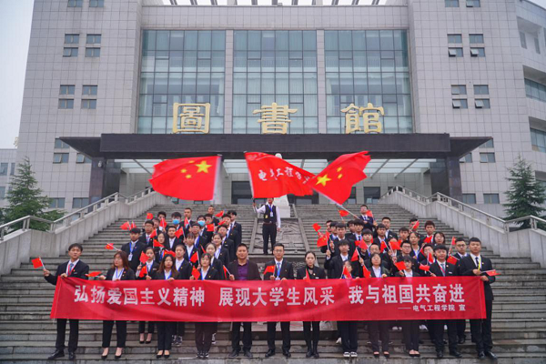 仲佳龙带领电气工程学院全体同学为祖国献词:“今天,我与祖国共奋进,我与祖国一道迎来了五彩缤纷的时代,我与祖国一起跨进了一个崭新的纪元!我与胸前的团徽一起,沐浴着新时代的和风为祖国祝福、祖国的明天更美好!”