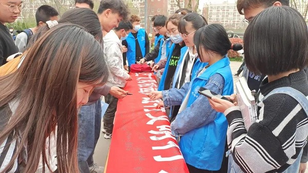 我院志愿者们将横幅置于大餐厅一楼门口对面,做好活动准备,他们积极有序的引导参加活动的同学们,在横幅上进行签字在红色条幅上签下自己的名字,并宣誓从自己做起,从小事做起,通过自己的实际行动使校园更加文明。创建文明校园是每一个师生的责任和义务,良好的校园环境,能为学校教育活动提供重要的阵地,为学生提供文明、和谐的校园氛围,促进学校的文明校园建设。