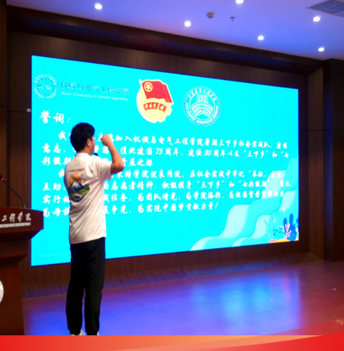 在志愿者宣誓环节,由刘全业领誓,全体志愿者庄严宣誓,表达出学生服务基层、奉献社会的坚定信念和决心。誓言声声,传递着青年学子的责任与担当,也彰显出学院师生对“三下乡”社会实践活动的重视和支持。