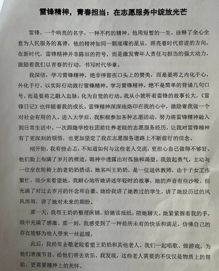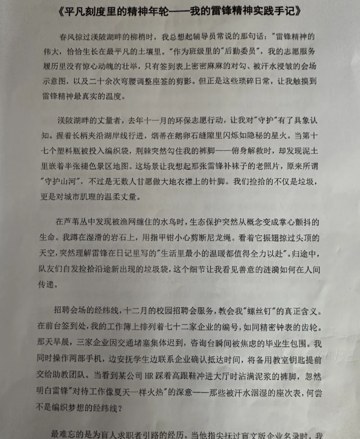 经过学长导师团队的精心指导与严格评审,最终遴选出一批优秀作品。这些作品主题鲜明、内容充实、情感真挚,多维度展现了同学们对雷锋精神的深刻理解与独特思考。暖伴学涯学长导师团队表示,希望通过此次征文活动,让更多同学深入了解雷锋精神,将其融入日常学习和生活,在新时代展现新作为,用实际行动书写属于自己的青春华章。