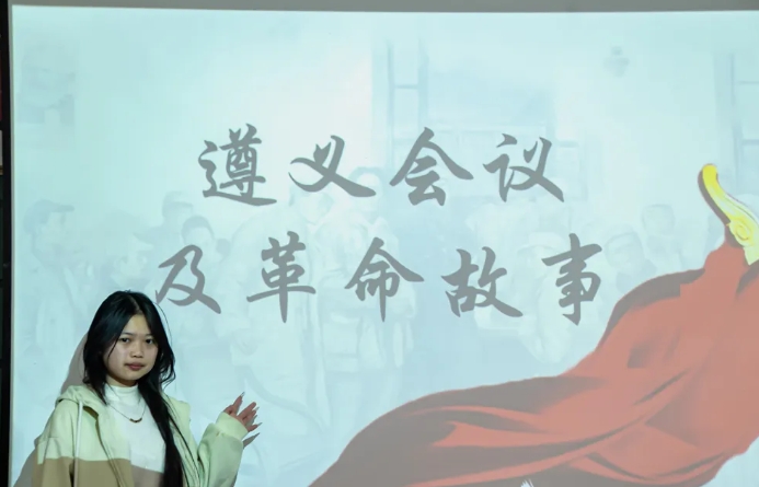 宣讲团队创新采用“沉浸式叙事”方式,让历史更具代入感。赵政同学化身战地记者,以第一人称讲述会场内外的紧张态势;李发旗、张春盈通过情景对话再现了张闻天与王稼祥的关键谈话;刘美琪、孙嘉鑫则利用动态时间轴,清晰梳理出会议前后红军的战略转变。这种多维度的呈现方式,让历史事件变得立体生动。