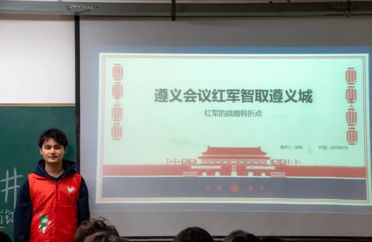 本次主题宣讲周由田翼帆同学牵头组织,积极响应团中央中国青年志愿者“遵义会议精神”项目,8位宣讲团志愿者分工协作,共同呈现了一场场生动的历史讲述。他们以遵义会议的时间脉络为主线,深度解析1935年那个改变中国革命命运的重要时刻。唐一涵同学在讲述会议筹备阶段时,特意展示了当年红军使用的马灯复制品,昏黄的光影投射在幕布上,瞬间将观众带回危机四伏的黔北山区。