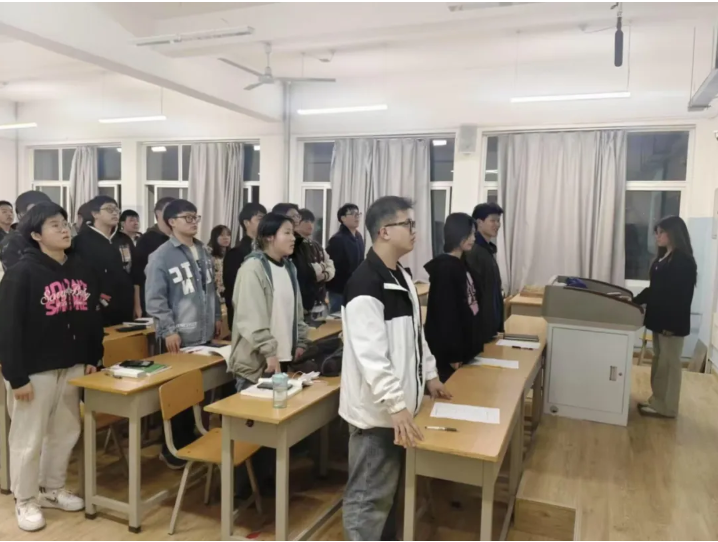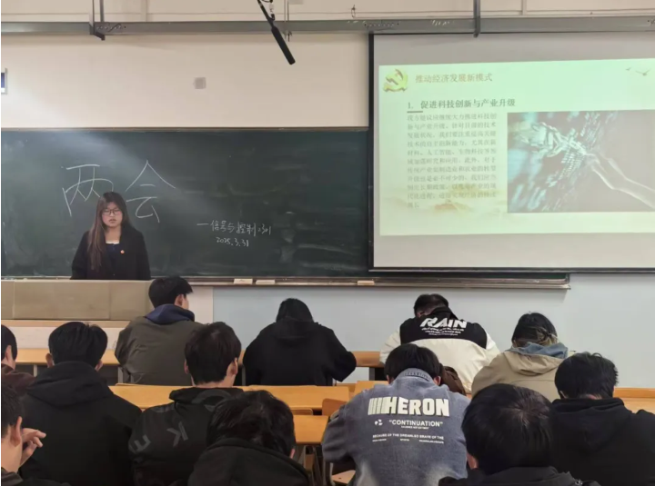 团课伊始,团支书带领全体同学齐声合唱共青团团歌,激昂的旋律激发了同学们的青春热情与使命感。随后,团支书带领大家回顾2025年全国两会的重要议程和核心内容,从政府工作报告到各项民生政策,从科技创新战略到社会发展规划,深入浅出地阐述两会精神,并结合大学生的责任担当进行剖析。团支书强调,两会是国家政治生活中的大事,关乎国家发展方向和人民福祉,而大学生作为新时代的主力军,肩负着推动国家进步、实现民族复兴的重要使命。