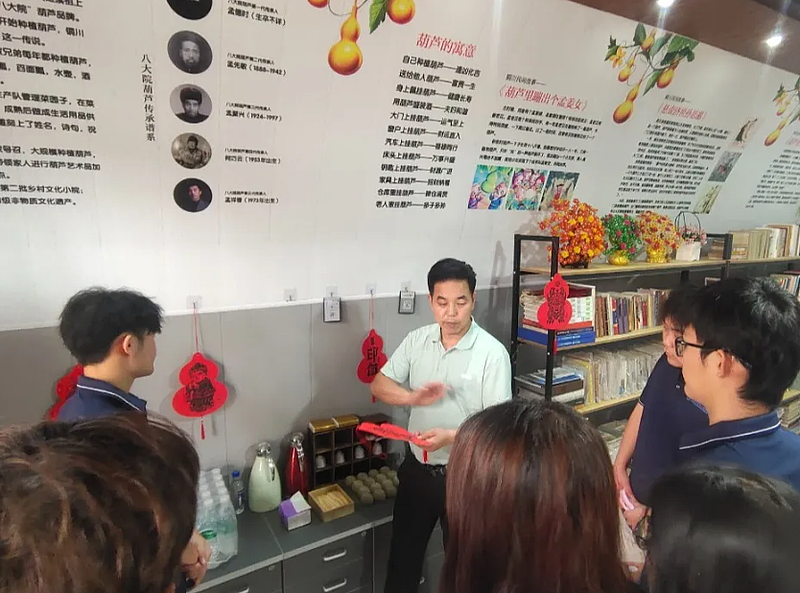 在王益区文化站高主任的带领与讲解下,志愿者们走进当地葫芦工坊,近距离感受葫芦雕刻与烙画技艺的独特魅力。工坊内陈列着各式葫芦作品,造型精巧、寓意深远。据介绍,该非遗技艺传承脉络可追溯至孟子后裔,其工艺内涵中融入了儒家“仁礼”思想,体现了传统技艺与精神文化的融合。