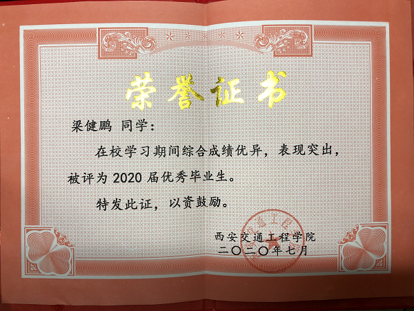 虽然课外活动占据了梁建鹏很多时间,但他在学习上并没有丝毫放松,反倒有了更多的压力,想要在被压缩了的时间内完成学习任务并取得优异成绩,需要花费更多心力和功夫。勤奋与自律让梁建鹏在校期间多次获得了荣誉称号:2018年三风建设工作“先进个人”;2017-2018年度“文艺好青年”;2018-2019年度“文艺好青年”;2018复兴杯科技创新作品大赛“一等奖”;2018-2019年度“科创之星”;2020届伟德国际1949“优秀毕业生”。