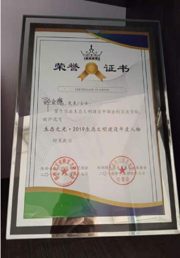 同年并被陕西省文化软实力研究会评为陕西省生态之光·2019年生态文明建设年度人物。